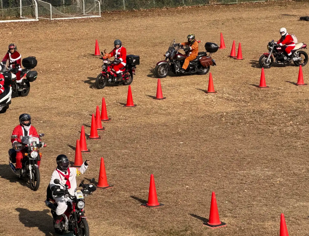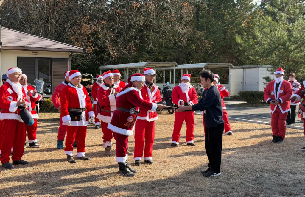 バイクに乗ったサンタクロースが今年も鹿深の家にやって来ました。このイベントは、一般社団法人二輪車振興協会様が主催する第8回トイランびわこというものです。主催者によると、本日やって来たバイクの数は37台とのこと。